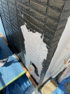 軒天の塗装作業後、外壁の中塗りを進めました!